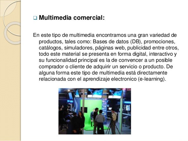 - Multimedia comercial: En este tipo de multimedia encontramos una gran variedad de productos, tales como: Bases de datos (DB), promociones, catálogos, simuladores, páginas web, publicidad entre otros, todo este material se presenta en forma digital, interactivo y su funcionalidad principal es la de convencer a un posible comprador o cliente de adquirir un servicio o producto. De alguna forma este tipo de multimedia está directamente relacionada con el aprendizaje electronico (e-learning).