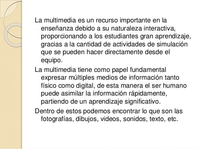 - La multimedia es un recurso importante en la enseñanza debido a su naturaleza interactiva, proporcionando a los estudiantes gran aprendizaje, gracias a la cantidad de actividades de simulación que se pueden hacer directamente desde el equipo. La multimedia tiene como papel fundamental expresar múltiples medios de información tanto físico como digital, de esta manera el ser humano puede asimilar la información rápidamente, partiendo de un aprendizaje significativo. Dentro de estos podemos encontrar lo que son las fotografías, dibujos, videos, sonidos, texto, etc.